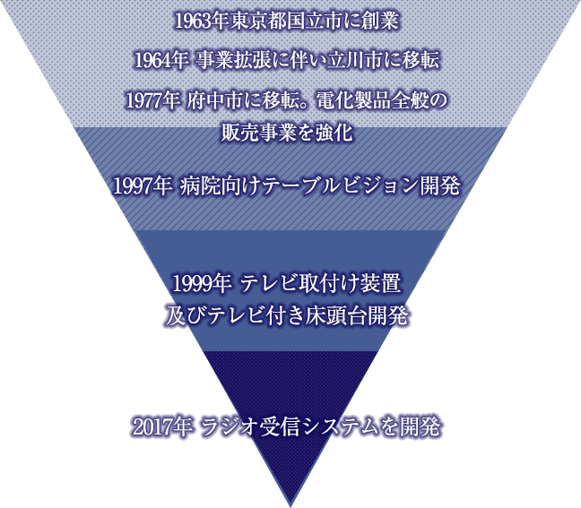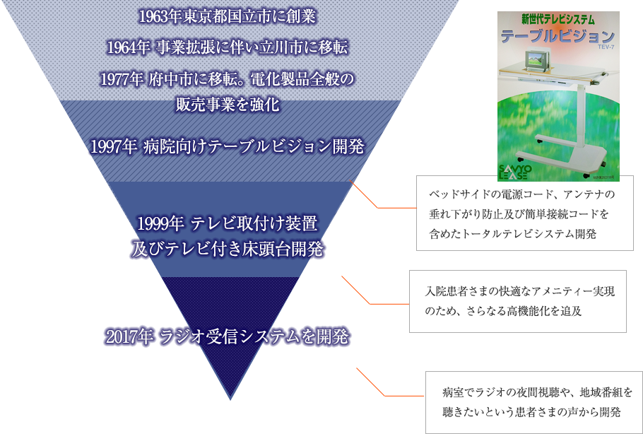 安全性と利便性の高いテレビシステムの実現に向け、お客様に喜んで頂くため、時には「医療現場に無い製品は自社で独自開発をしてしまおう」の精神で、試行錯誤を重ねながら、テレビ取付け装置及びテレビ付床頭台やラジオ受信システムなど独自製品を開発してきました。